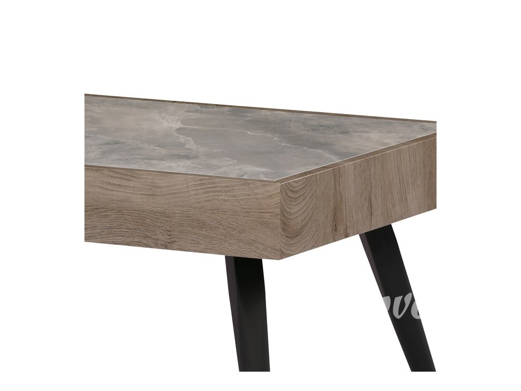 Tento stůl je ztělesněním všestrannosti a stylu. Jeho slinutá keramická deska zdobená elegantním mramorovým dekorem vyzařuje sofistikovanost a je ideálním středobodem jakéhokoli prostředí od rušných konferenčních místností v kancelářích až po klidné obytné prostory. Šedý odstín keramiky se hladce snoubí s rozmanitými interiérovými paletami, což zajišťuje, že tento kus je důkazem nadčasového designu.