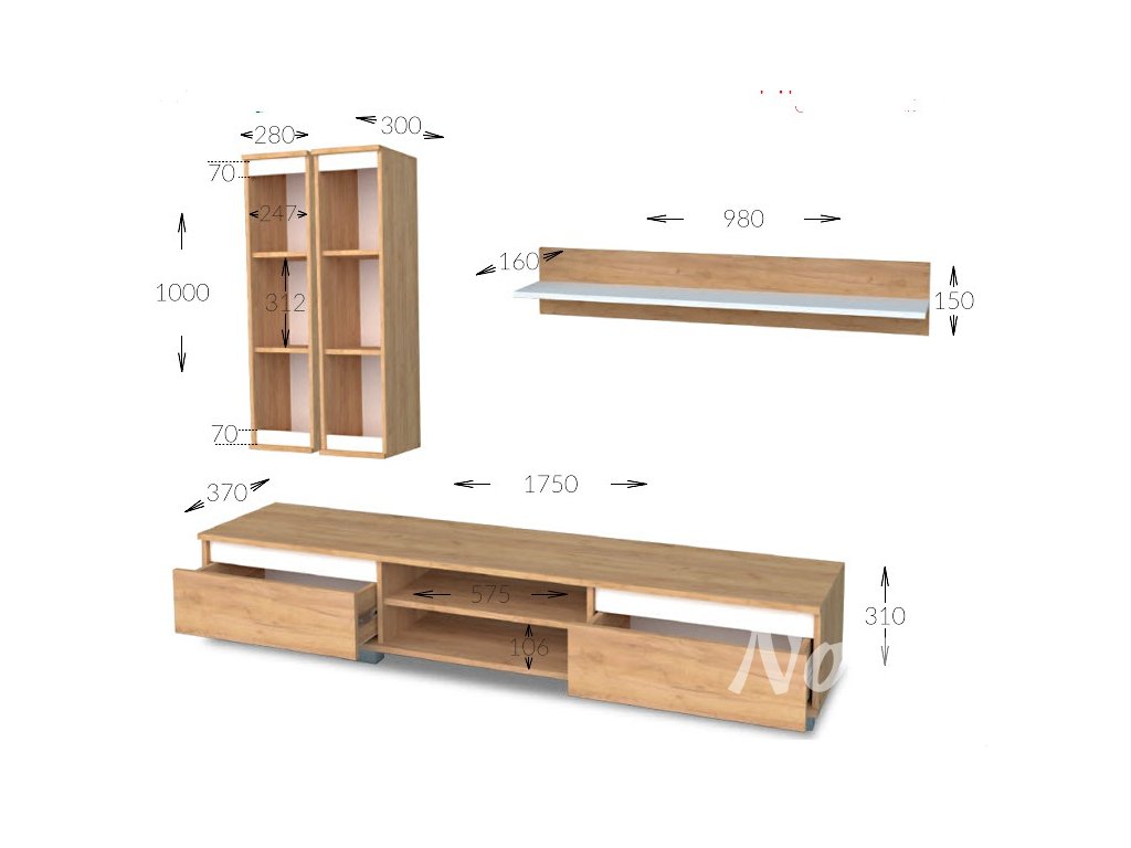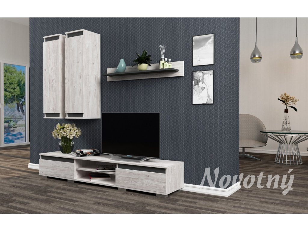 Levná obývací stěna v moderním barevném provedení se stane výrazným prvkem každé místnosti. Kombinace bílé barvy se vzorem alaska s dekoračními lištami z MDF šedé lesklé barvy. Nábytek je vyroben z kvalitního lamina hraněného melaninem. Sestava se skládá z ( šířka/hloubka/výška ) - televizní stolek se 2 zásuvkami ( 175,2 x 37 x 31 cm ), 2x závěsná skříňka 1-dveřová ( 28 x 30,6 x 100,2 cm ) a police ( 98,2 x 16 x 15 cm ). Tato stěna se prodává jako sestava, jednotlivé díly nelze koupit zvlášť. Dodáváme v demontovaném stavu.